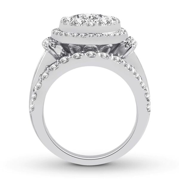 Imagine her surprise when she sees this unforgettable engagement ring. With a center arrayed in dazzling round diamonds, the ring is sure to capture attention. The band showcases a sparkling row of round diamonds at the top and bottom with a line of baguette diamonds in the center to complement. Styled in beautiful and versatile 14K white gold, the ring has a total diamond weight of 3 1/2 carats. Available online while supplies last. Previously Owned Treasures are not eligible for in-store pickup. Previously Owned Treasures may only be shipped either to your home address or to an alternate address.